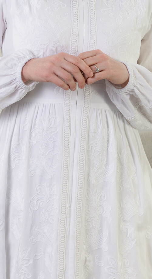 A zip front masterpiece (if we do say so ourselves). Comfy, medium weight, cotton crepe with flexibility and movement is embroidered in soft silky paisley and botanical motifs. Zipper, collar and sleeves are accented with a ladder lace trim for definition. Natural waistband and lantern shaped sleeves finish this timeless silhouette. Fully lined, and elastic at the cuffs.