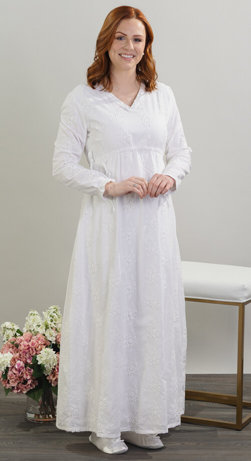 A striking new cotton fabric with floral and vine 3D embroidery is the centerpiece for this simple column style. Fully lined in lightweight cotton. The rounded empire waist is cinchable to your desired fit with functional drawstrings that you can tie into bows (or plain knots) at the sides — AND for a finishing touch — cinchable wrist ties that can create a ruffle and bow (if you like bows).  V-neck with a keyhole back.