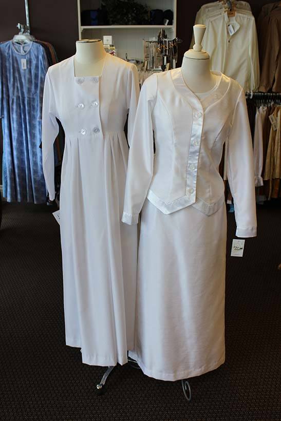 White Elegance is an LDS Temple clothing store in Murray, Utah, for men and women. We carry a complete line of LDS Temple Dresses, White skirts, tops and shoes. Baby Blessing dresses and outfits, Baptism dresses, Pioneer and Prairie Costumes that are approved for Youth Trek, Modest Sunday dresses, Busy and Quiet books.