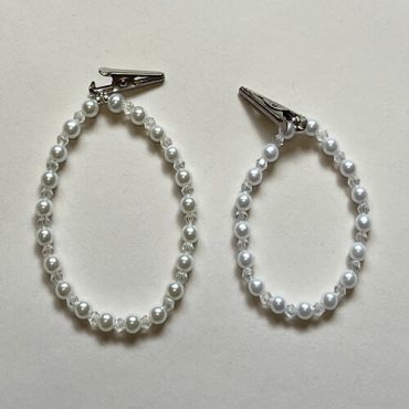 A sweet stretch, pearl bead and crystal bracelet with a silver clip, keeps your name card front and center. No need to fish in your pockets or wonder if your name card is lost on the floor. Makes a great gift.