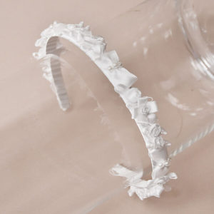 Satin covered headband embellished with 1/4 inch satin ribbon flowers, bows and pearls.