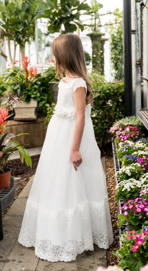 So, you're looking for the most beautiful dress for your little one and you stumble upon this Fairy Godmother dress. It's named that for a reason. It's extraordinary and steals the show. Fully-lined, soft tulle accentuated with high end, delicate lace on sleeve, bodice and bottom of the dress. Back zipper with large satin bow in the back. Detachable front flower of satin rosettes, lace and flower with rhinestone. Stunning.