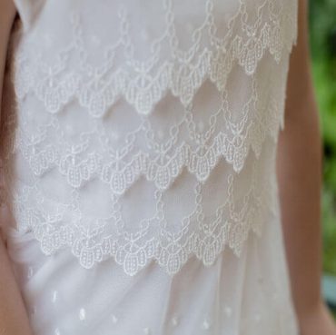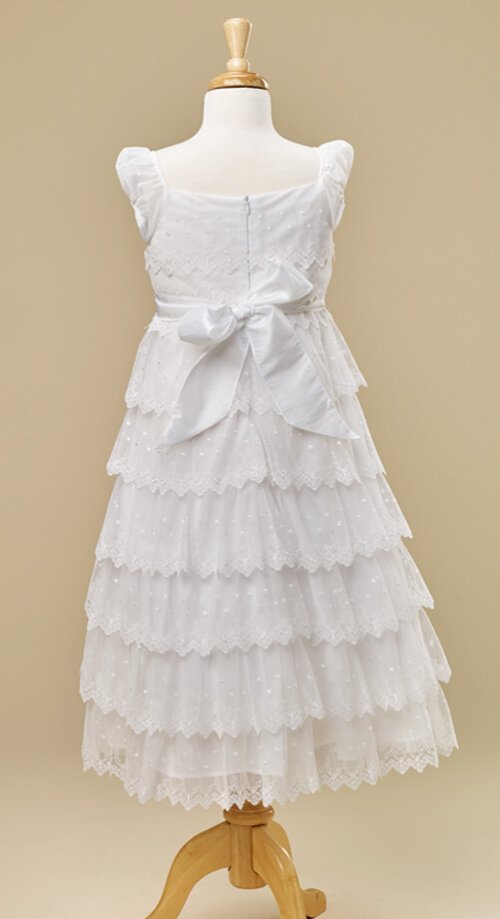 If your little one loves lace, this is the Baptism or Communion dress for her.  Delicate layers of tricot lace with scattered embroidered dots, flowers and scalloped edges.  Simple square neckline and cap sleeve.  Satin tie in the back allows for a perfect fit.