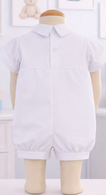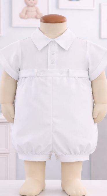 Another classic choice for your little man. Short sleeves on a dress shirt belted romper. Rayon polyester gabardine is so soft against baby's skin. Leg snaps and 2 buttons on the back make dressing a breeze. Decorative buttons on the shirt front and waist. Pants are gently gathered into leg bands.