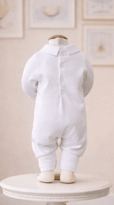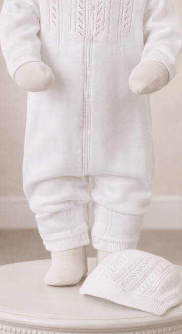 These sweater knit styles are always popular! This one has the most beautiful detailing the entire length of the romper. The bodice and cap feature pointelle work flanked by knitted cables and rows. Ribbed collar and cuffs. Silky soft and cool to the touch 100% cotton. Sturdy snaps and buttons at the back bodice for dressing. Machine washable.