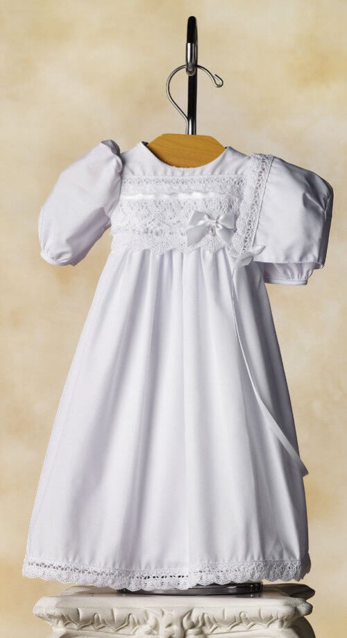 So sweet, white cotton baby dress with cluny lace on bodice.  Comes with bonnet, blanket and bib.  Long sleeve. Polycotton.