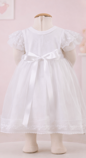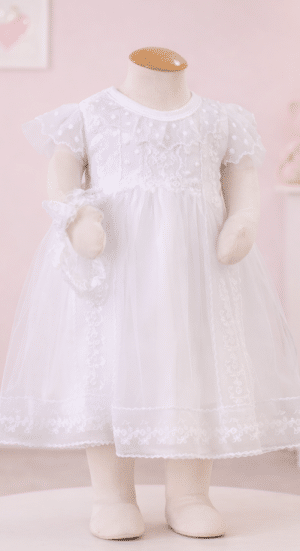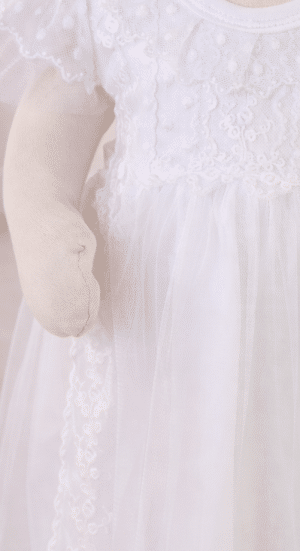 One of our newest dresses has a bit of whimsy.  So sweet and fun it made us think of poppies! Scalloped edged polka dot ruffles at the neck and sleeve are playful. Soft English tulle creates princess volume and is finished with embroidered flowers and vines.  Satin ribbon ties at the waist are ready for a bow.  The base and neck are super stretchy cotton knit.  Comes with a spritely headband with the same embroidered tulle in a bow. Total length is approximately 16".