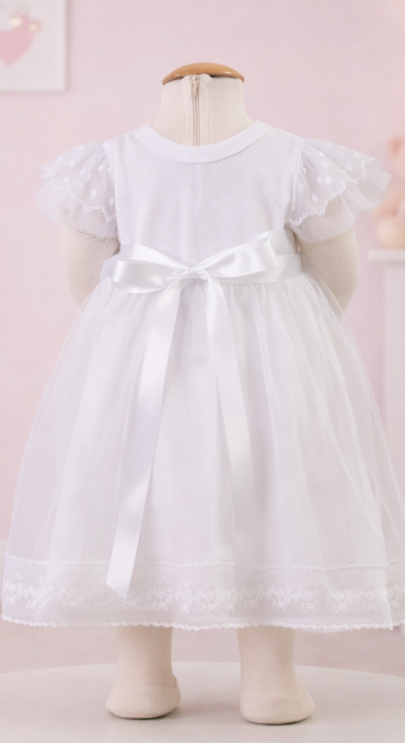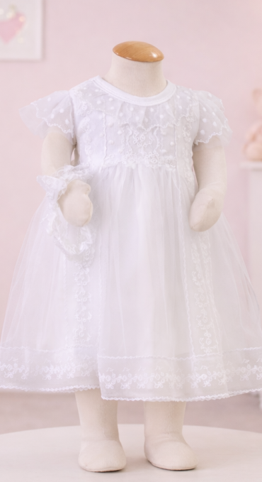 One of our newest dresses has a bit of whimsy. So sweet and fun it made us think of poppies! Scalloped edged polka dot ruffles at the neck and sleeve are playful. Soft English tulle creates princess volume and is finished with embroidered flowers and vines. Satin ribbon ties at the waist are ready for a bow. The base and neck are super stretchy cotton knit. Comes with a spritely headband with the same embroidered tulle in a bow. Total length is approximately 16".