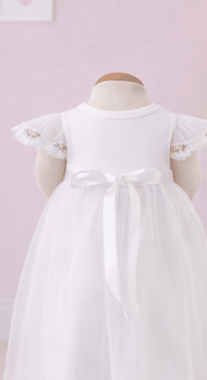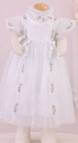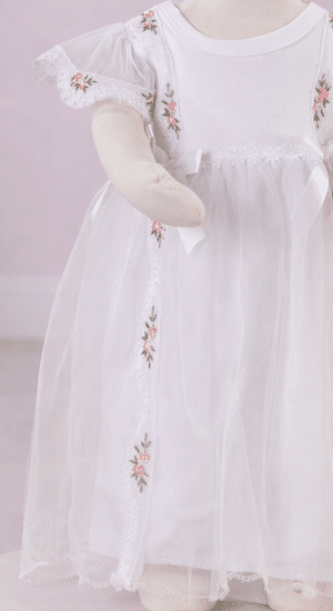 Pink!  We are so excited to offer our first dress with a touch of pink! She has us enchanted. Two layers of whisper soft tulle skirt and flutter sleeves finished with the sweetest white lace trim with pink rosebuds and sage foliage.  Satin bows and bloomers that snaps add to the charm.  Lining and neck are 100% cotton knit.  Bonus head bow.  It will have everyone smiling on the day.