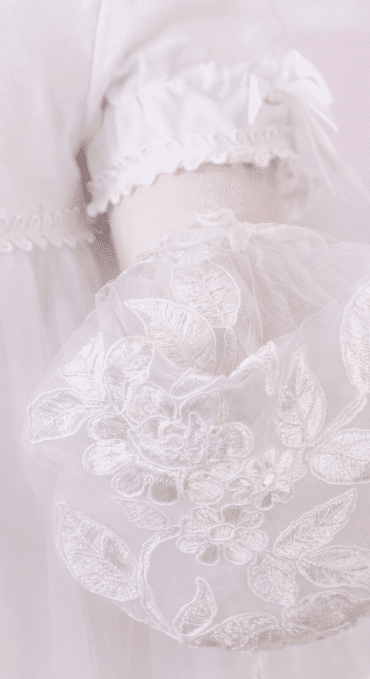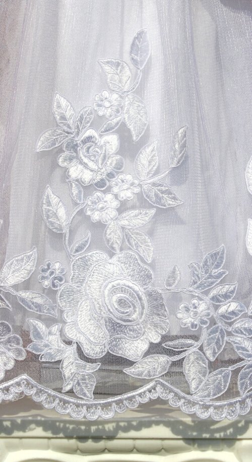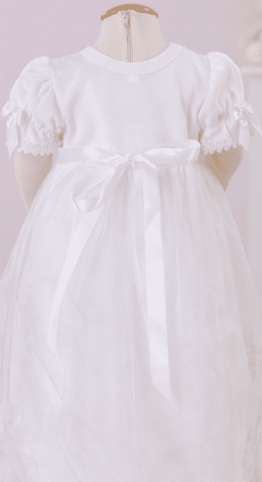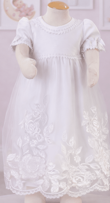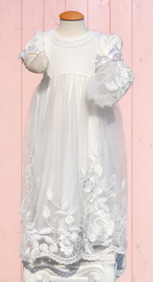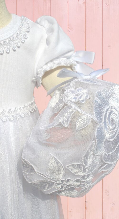 Two layers of tulle with rose and vine appliques cover a soft jersey knit dress.  Flower trim accentuates the neck, waist and sleeve trim.  Ties in the back with match bows on the sleeves and perfectly adorable hat with gentle elastic banding.  Just makes you want to hug the precious little babes whether it's worn for a Blessing dress, Baptism or Bridal party.