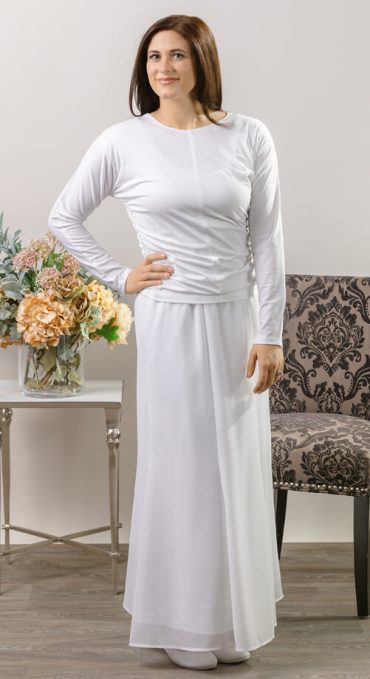 This sassy little all-purpose slightly textured knit top is sure to extend your temple wardrobe with comfort. Classic dolman sleeve with ruched sides creating a waist. Round neck and center front and back seam details will add definition to any outfit. Just enough spandex for softness and keeping its shape.