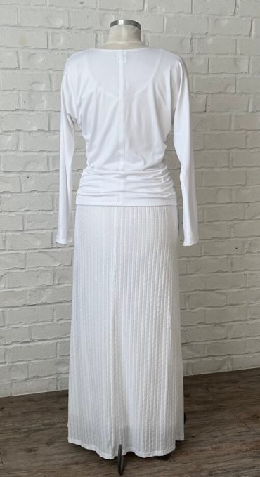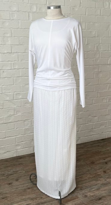This sassy little all-purpose slightly textured knit top is sure to extend your temple wardrobe with comfort. Classic dolman sleeve with ruched sides creating a waist. Round neck and center front and back seam details will add definition to any outfit. Just enough spandex for softness and keeping its shape. The stretch knit skirt with elastic waist for ease and two side pockets is just the contract in fabric for a chic and fresh look. Skirt is fully lined.