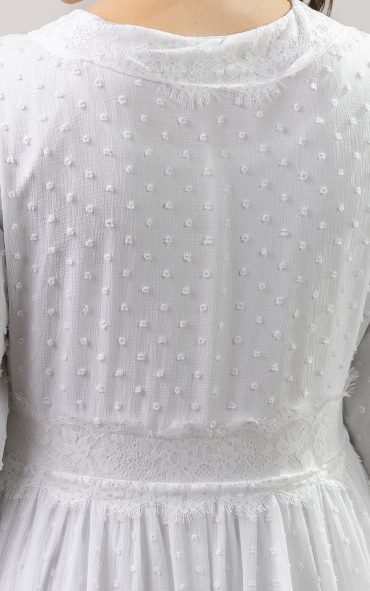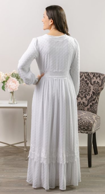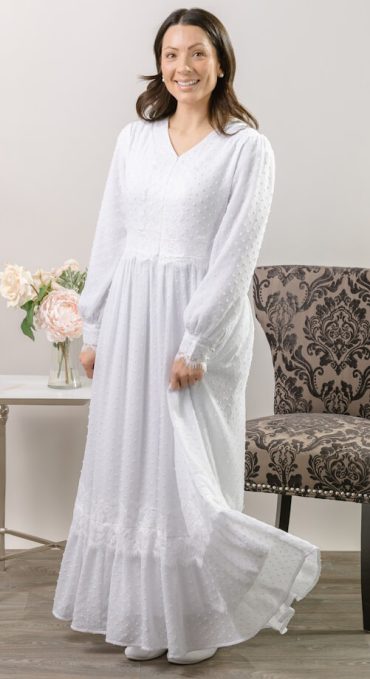 This white front zip LDS Temple dress is the epitome of modern elegance with a romantic twist. Fully-lined gown is crafted in a flattering silhouette, with delicate eyelash lace on the front bodice, cuffs, and bottom tier. Slightly puffed sleeves add subtle volume and a vintage-inspired charm, fitted at the wrists with matching lace-trimmed cuffs for a polished finish. Full skirt for a flowing and comfortable fit. This design strikes the perfect balance between timeless grace and modern flair for a stand out piece in your Temple wardrobe.