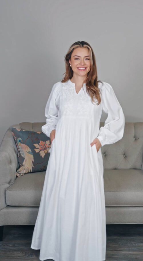 Seersucker!!! White Elegance designer is excited to offer a stunning new lightweight, breathable fabric in a timeless style.  All components are 100% cotton — including the dress lining and embroidery.  Face framing split neck yoke is accented with botanical needlework on the front and across the shoulders in the back.  Keyhole at the back neck for easy over the head dressing.  Generous, unlined raglan sleeves are finished with a functional button cuff complementing this simple cozy beauty for years of enjoyable LDS temple learning.