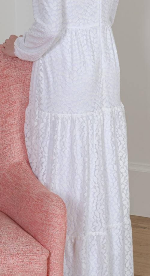 This empire waist beauty is flattering on every shape!  You’re going to love the stretch and texture of this simple leaf lace pattern.  So comfortable! Simple V-neck with a zipper at the back (in case you need it).  Waistline is raised and bodice is finished with bust darts.  Skirt is gathered in three generous tiers that might tempt you to twirl. Sleeve cap is gathered for a generous bicep — and the cuff is elasticized. Skirt is finished with a pearl edging. Fully lined. Pockets in the side seams.