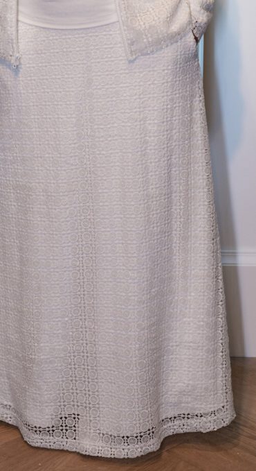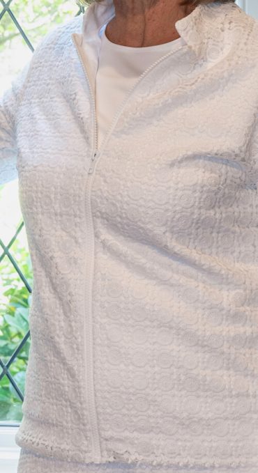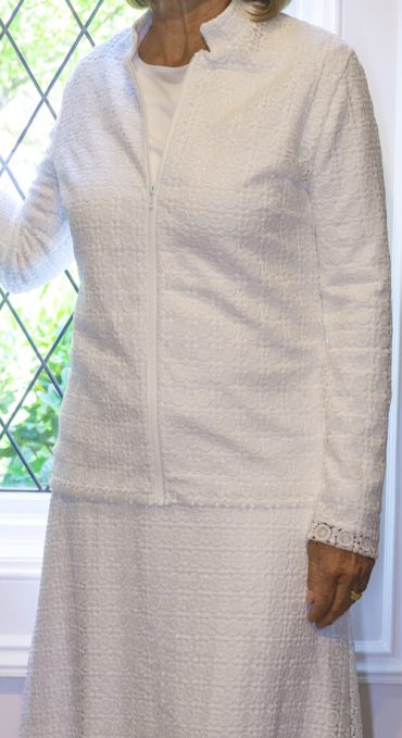 Our designers hit the ball out of the park with this unique set with a front zip, fully lined jacket and skirt. You will fall in love with the simplicity of pulling on this fabulous lace jacket over a top or wearing it zipped alone. Two inch size vents in the bottom side seams of the jacket make it fit just perfectly over the hips and allows you to access the deep side pockets of the a-line skirt. Elastic waist back and flat front waist band. This will be a favorite of LDS Temple workers and patrons. Mix and match jacket and skirt for your own perfect fit. Shown with White Elegance T'shirt. Available in short or long sleeve. Our T's never shrink, pill or loose their shapes in the washer and dryer.
