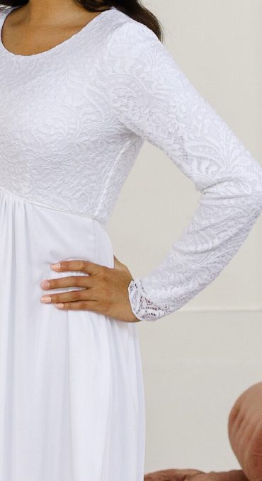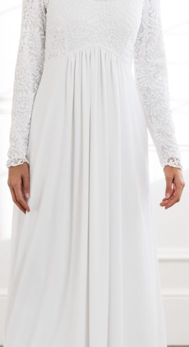 Soft, luxurious raised lace places this white dress in the simply glorious category! Stretch lace bodice front and back with a sweeping skirt of soft doby fabric. Fully lined with opaque denier that makes this dress simply comfortable and flattering. The elongated back creates a slimming silhouette. Careful styling, sizing and the piping at the empire waist make this a favorite LDS Temple dress. Kudos to our White Elegance Design Team! Add a matching vest for a two piece option. Side vents on vest make it easy to reach your two deep side pockets.