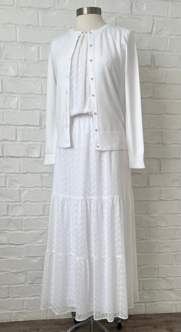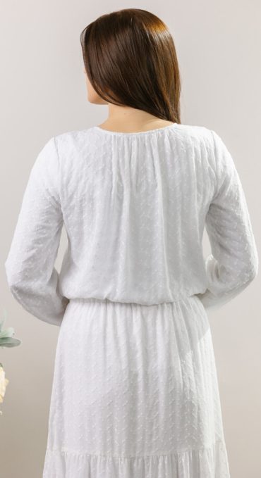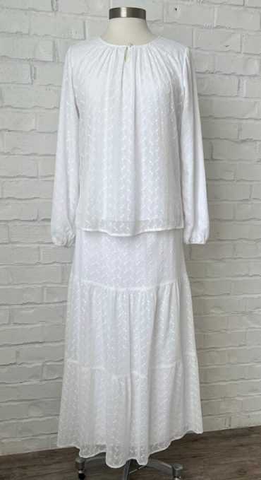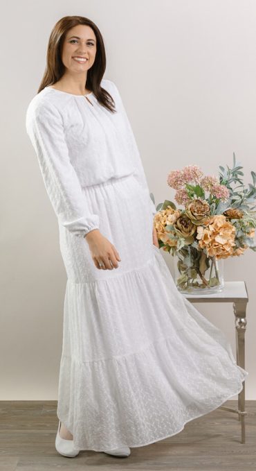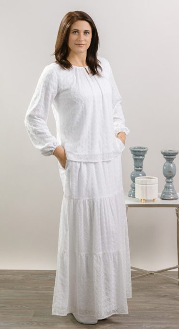 Three tiers of joy! Just what you need to reinvigorate your temple wardrobe: a delicately embroidered georgette skirt and coordinating blouse to mix and match with all your LDS Temple clothing. An elastic waistband makes for an easy-fit pull-on style skirt. Wear the front button closure top tucked in or loose for a different look. Wrinkle-free polyester fabric will make this a go-to option for temple workers. Add the Bora Bora skirt of the same fabric for a three-piece set to expand your wardrobe.