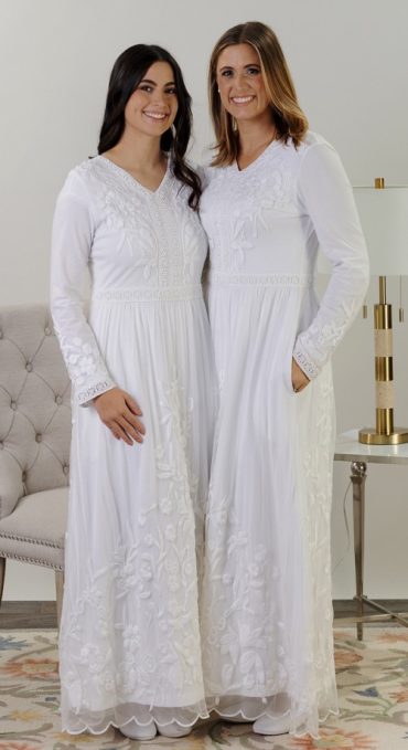 Welcome to our vision of the Garden of Eden. We started drawing these flowers, vines and leaves on a life size paper pattern -- aiming to get their perfect placement front and back. Then we were blessed to find a factory that could bring it to life with a combination of hand and machine embroidery. The base is a silky mesh, while the embroidery and lining are equally silky cotton. The V-neck, waist and cuffs are trimmed in a 3-dimensional floral lace. Natural waist bodice and simple sleeves let the embroidery do the talking. Hem is embroidered with a simple scallop. Two pockets. Hand wash and drip dry.