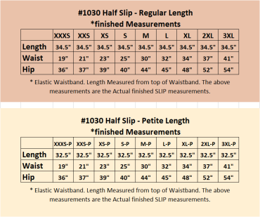 | Slip Sizes | XXS 0/2, XS 4/6, S 8/10, M 12/14, L 16/18, XL 20/22, 2X 24/26, 3X 28 |